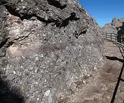 The dominant clast lithology in the conglomerate is limestone and the sequence is cemented by calcite. The presence of so much carbonate in the rock has led to the formation of typical karst landforms, such as cave systems and karst towers.[5]