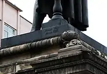 The inauguration of the second Columbus statue coincided with the 400th anniversary of Columbus's first voyage and an opportunity for the regime of Porfirio Díaz to reshape the image of Columbus for the current era in Mexican history marked by economic expansion tied to foreign investment rather than Christian evangelization of the late 15th and early 16th centuries. The 1877 statue had been sponsored by a wealthy Mexican railway magnate, Antonio Escandón, who had collaborated with the French-supported regime of Maximilian of Habsburg. Creating a second Columbus monument with different symbolic signifiers for the Mexican capital. The statue was placed by the Buenavista railway station, at the time a major site in the capital. The Mexican government fully embraced the celebrations of the Columbus anniversary, with many state-sponsored events. The government also shaped the rhetoric concerning Columbus for their own ideological purposes, pointing to him as the one who initiated an era of global trade.[4] The 1892 monument makes no reference to Spain, and the engraving on the pedestal reads simply "To Christopher Columbus. 12 October 1892" (A Cristóbal Colón. 12 de octubre de 1892). At the inauguration of the statue, there were speeches making reference to Spain, but the symbolism of Columbus was as navigator, not as a conqueror, an innocuous message at the time.[5]