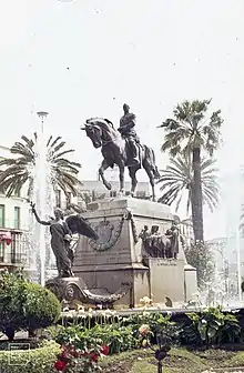 Building works started on 2 October 1928.[2] Benlliure reportedly used a horse from the regiment of Hussars of La Princesa as model for the equine figure.[3] The front side of the pedestal features a coat of arms of Spain and an inscription reading: "al ilustre jerezano, restaurador del orden, miguel primo de Rivera y orbaneja, pacificador de marruecos y marqués de estella. la patria agradecida." ("to the illustrious jerezano, restorer of order, Miguel Primo de Rivera y Orbaneja, Peacemaker of Morocco and Marquis of Estella. The grateful homeland").[2]