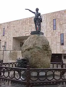 The statue stands 2-metre high and its bronze base reads terror romanorum ("terror of the Romans"),[4] an epithet for Viriathus attributed to the Orosius' chronicles. The statue and the quadrangular base stand on a granite pedestal taken from Torrefrades, one of the pretenders claimed to be the Viriatho's birthplace.[5] The granite block features a battering ram emerging from its front side,[1] cast in bronze in 1903.[6]