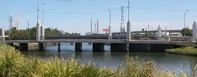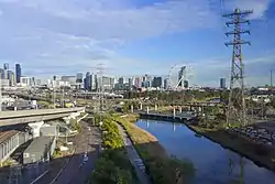 In 2002 the downstream end of the creek was realigned, to accommodate development of Victoria Dock at the Port of Melbourne. Moving the confluence with the Yarra River about 600 metres upstream, the creek mouth once located at the east end of Appleton Dock was removed, with a new watercourse dug leading directly south parallel with the Bolte Bridge approach spans.[3] The realignment created a buffer zone between the port and the Melbourne Docklands residential and commercial areas.[4] While realigning waterways is not a preferred option for Melbourne Water, the work was permitted as previous modifications had left the creek lacking a "true remaining 'natural' alignment" in the area.[3]
