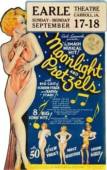 Moonlight and Pretzels is a 1933 American Pre-Code musical film, directed by Karl Freund, about a man who puts on a Broadway show. The film was released by Universal Studios and featured Mary Brian and William Frawley, now best-known as "Fred Mertz" on the 1950s TV show I Love Lucy; Freund was the groundbreaking cinematographer for I Love Lucy.