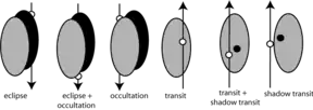 At present, the orbits of the Haumean moons appear almost exactly edge-on from Earth, with Namaka having periodically occulted Haumea from 2009 to 2011.[14][15] Observation of such transits would provide precise information on the size and shape of Haumea and its moons, as happened in the late 1980s with Pluto and Charon.[16] The tiny change in brightness of the system during these occultations required at least a medium-aperture professional telescope for detection.[17] Hiʻiaka last occulted Haumea in 1999, a few years before its discovery, and will not do so again for some 130 years.[18] However, in a situation unique among regular satellites, the great torquing of Namaka's orbit by Hiʻiaka preserved the viewing angle of Namaka–Haumea transits for several more years.[4][17]
