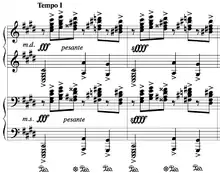 The fourth piece, called Polichinelle (Полишинель, Polishinyelʹ), is in an ambiguous key although often referred to as "in F♯ minor" (the F♯ minor triad has never been established throughout), and played Allegro vivace. It is a character piece, based on the Commedia dell'arte character Pulcinella (Polichinelle is the French translation of this word) from which Punch (from Punch and Judy) derives. It is in ternary form (ABA), beginning and ending with a fast section that gives way to a slower, lyrical melodious passage in the middle.