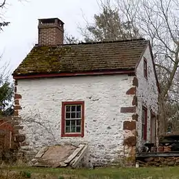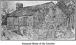 President Lincoln had only a vague knowledge of his Pennsylvania ancestors, believing that they were Quakers from Berks County. The first Mordecai Lincoln lived in Scituate, Massachusetts. Two of his sons, Abraham and Mordecai Jr., the president's great-great-grandfather, first moved to New Jersey before 1714 and then to Pennsylvania in 1720. Mordecai Jr. settled near the present day Coventryville, Chester County and became a partner in the Coventry Forge with Samuel Nutt Sr. and William Bransom, then selling that interest for five hundred pounds in 1726. He moved to Amity Township, Philadelphia County (now Exeter Township, Berks County) sometime after 1727. In 1729 Mordecai Jr. leased a thousand-acre farm and married his second wife, Mary Robeson. He later bought the farm and built his house on it about 1733. The house was enlarged about 1760 and a separate summer kitchen was built in the early nineteenth century.[4]