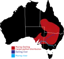 Morelia spilota metcalfei is a python subspecies[2] found in Australia, commonly known as the Murray Darling carpet python. The pythons are non-venomous snakes that constrict their prey. They grow up to 2.7m (9 feet), but adults are usually around 2.4m (8 feet).[3] Color varies depending on locality; Victorian MDs are silver with solid black blotches and stripes, as we move into NSW the silver becomes a light brown and the patterning becomes more of a dark brown rather than black, the SA MDs introduce patches of maroon.[4] These pythons are semi-arboreal, typically inhabiting rocky outcrops, dry woodlands, riverine forests and flood plains.[4][5] The threats to the snakes are people and other snakes.