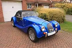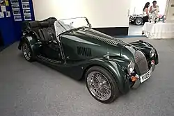 The Morgan Roadster is a model produced by the Morgan Motor Company. It was introduced in 2004 replacing the Morgan Plus 8. The car is identical to its predecessor except for new modern Ford V6 mechanicals. The new engine develops similar power, though less torque,[1] and is slightly lighter than the Rover V8 which results in increased performance and better fuel economy. Air conditioning is now standard on U.S. models. Like its predecessor, the chassis consists of a standard ladder frame design[2] and is built from galvanised steel with five tubular or box section cross members. The body is built of steel and aluminum around an ash frame. Suspension is traditional Morgan slider type up-front and solid axle / leaf spring at the rear.