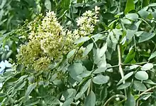 The leaves are light green when mature,[13] up to 55 cm (22 in) long, and attached alternately to the stem by short petioles.[11] They are bi- or tripinnate in composition, with about five pairs of pinnae and three to nine leaflets on each pinna.[9] Each leaflet is 3.5–6.5 cm (1.4–2.6 in) × 2–3.5 cm (0.8–1.4 in) in size and elliptical to ovate in shape, with an acute tip and a round-to-cuneate base.[11] Stipule-like extrafloral nectaries are typically present at the base of the leaves.[11][14]