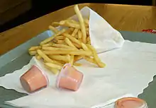 Food common to the Mormon regional area is similar to Midwest comfort food, or "country home cooking."[56] Eric Eliason, a folklorist specializing in Mormon traditions, says that Utah scones, funeral potatoes, and green Jell-O are unique to Utah.[57] In 2001, lawmakers named green Jell-O as Utah's state snack. The Salt Lake Tribune sponsored a Jell-O haiku contest from 2006 to 2016.[58][59] The advent of supermarkets and canned goods in the 20th century homogenized food in the Rocky Mountain area, including Mormon cuisine, to include "American" staples such as soda and French fries.[60] Fry sauce, a mixture of ketchup and mayonnaise, possibly originated in Utah. The "distinctive dipping sauce" is often served in burger joints there.[61] Dutch oven cooking is popular in the Rocky Mountain area, and food prepared in Dutch ovens isn't limited to stews but ranges from bread to roasts.[62] Utah is the second-largest market for Rhodes brand dinner rolls, and Salt Lake City consumed the most soda of any city in 2004. Ice cream is popular,[63] and generic American food restaurants and pizzerias are common. Farmer's markets include vendors who sell jams and salsa. Seasonal food festivals abound in Utah, including Bear Lake's raspberry festival and Payson's onion days.[64]