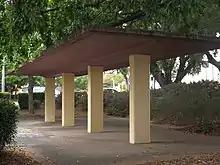 The Morningside air raid shelter is a rectangular concrete structure comprising a heavy floor slab, which is now covered by concrete pebbling, and a flat roof supported by concrete piers. There is also a coloured mosaic on the western side of the floor slab. There is evidence on the soffit of the two entrances on the Wynnum Road side. The shelter stands within a vegetated road reserve, northeast of the Morningside Railway Station, with a canopy of mature fig trees and camphor laurels. The roof of the shelter is painted maroon and the piers are painted cream.[1]