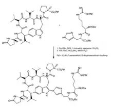 A simplified reaction scheme showing the formation of the Trp-His crosslink, from Castle and coworkers. This oxidative coupling step has been used in several subsequent synthesis attempts.[6]