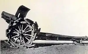 The Mortaio da 210/9 modello 1914 was a breechloading gun with a steel barrel, box trail carriage, two wooden spoked wheels with steel rims, gun shield, hydro-pneumatic recoil mechanism, a Schneider interrupted screw breech, and it fired cased separate-loading ammunition with up to eight bagged charges to vary velocity and range. The box trail carriage had a large hollow section near the breech to allow for high angle fire and like other large Schneider guns, there was an integrated loading tray attached to the breech. Its combat weight was 7,180 kg (15,830 lb) and for transport, it could be broken down into two wagon loads. The barrel could be removed and moved on its wagon load, while the second wagon load consisted of the carriage and a limber to support the tail of the carriage and towed by an artillery tractor.[1]