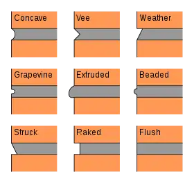 In masonry, mortar joints are the spaces between bricks, concrete blocks, or glass blocks, that are filled with mortar or grout. If the surface of the masonry remains unplastered, the joints contribute significantly to the appearance of the masonry.[1] Mortar joints can be made in a series of different fashions, but the most common ones are raked, grapevine, extruded, concave, V, struck, flush, weathered and beaded.