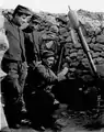 Often defenders would wait out a preparatory artillery bombardment in reinforced dugouts and once the bombardment had lifted they would man their trenches and machine-gun nests in anticipation of an enemy attack across no man's land. Barbed wire was often used to channel attackers away from vulnerable areas of the defender's trenches and funnel attackers into predefined kill zones where overlapping fields of machine-gun fire could be brought to bear or to hold attackers at a safe distance to call in defensive artillery fire. The machine-gun nests could be constructed of sandbags, timber, corrugated metal, and concrete with overhead protection. For infantry advancing across no man's land, all they may see is a small horizontal opening at waist level, with just the top of the gun shield showing. Attacking infantry would have to close on these positions while under fire and destroy them with rifle fire, grenades, and flamethrowers.[3]