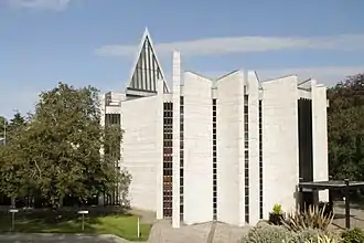 The main chapel was built at an angle that could maximise the natural light. The windows are tall, glazed slits. The walls are constructed from white calcined flint aggregate concrete blocks in three sizes arranged to give a distinctive pattern.[3] The chapel has tall, angled fins that provide dramatic shapes.[6] The use of light and colour has been compared to the effects seen in Coventry Cathedral, also designed by Spence. From the main buildings a simple concrete cross can be seen, positioned on a small hill, a feature copied from Gunnar Asplund's Woodland Crematorium in Stockholm.[3] Overall the crematorium design achieves 'calmly expressionist forms'.[7] The design stands out from the other 250 or so crematoria across the UK.[8]