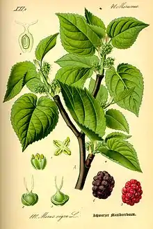 The black mulberry was imported into Britain in the seventeenth century in the hope that it would be useful in the cultivation of silkworms (Bombyx mori). It was unsuccessful in that enterprise because silkworms prefer the white mulberry. However, the plantings have left a legacy of large and old trees in many country house gardens and it was listed in the Award of Garden Merit of the Royal Horticultural Society until 2013.[8] It was much used in folk medicine, especially in the treatment of ringworm.