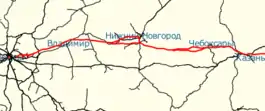 The Moscow-Kazan High-Speed Railway is a planned 772-kilometre long high-speed railway line connecting the two major cities of Moscow and Kazan in the Russian Federation, going through the intermediate cities of Vladimir, Nizhny Novgorod and Cheboksary. The project has an expected completion date of 2023, and is slated to be the first segment of an ambitious transnational high-speed railway set to connect Beijing and Moscow over a distance in excess of 7,000 kilometres, which is currently under consideration by the governments of Russia and China.[4] Planning work was finished in September 2017.[5] Preliminary construction on stations and platforms, with space reserved for the railway, started in spring 2018.[6] Construction on the railway has been postponed as of March 2020, due to the high cost (estimated at 1.7 trillion rubles) and in lieu of further studies on ridership.[7]
