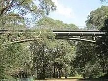 An arched steel aqueduct built for the purpose of enabling water mains to be carted over a gully, linking Avenue Road and Bay Street Mosman. The single span steel arch aqueduct currently carries three pipes. Two 500-millimetre (20 in) mild steel cement lined pipes laid between 1968 and 1971 and a 600-millimetre (24 in) mild steel cement lined pipe which replaces a rivetted original with the same diameter. The fix ended steel arch has a span of 42.68 metres (140.0 ft) with arch members being "18inches x 7 inch x 75lbs per ft." A pedestrian walkway was built along the top of the pipes and the arch now serves a dual purpose.[1]