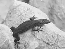 The Mosor rock lizard is usually found in high rainfall areas at altitudes between 450 to 1,900 metres (1,480 to 6,230 ft). Its typical habitat is limestone outcrops or karst regions above the treeline. It also occurs on juniper-clad slopes, in open woodland and around springs. Females lay a single clutch of about four eggs once a year. The eggs are retained within the female for about five weeks after mating and hatch about two and a half weeks later. The juveniles are less than 3 cm (1.2 in) long when they hatch and have very long tails.[2]