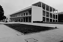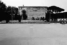 The Latin America Pavilion constitutes the other half of the headway leading to the Fountain. Designed in 1938 by Bruno Lapadula as a group of Bank of Italy pavilions arranged around a garden courtyard. On the façade overlooking the fountain was a painting by Giorgio Quaroni. The pavilions were damaged by war bombings and subsequently restored for the reopening in 1952 on a project by Michele Capobianco, Arrigo Marsiglia and Alfredo Sbriziolo. The 1952 project endowed the pavilion with a loggia characterized by a rationalist appearance with typical Nordic origins that recall in particular the Dutch neoplasticism and the slender steel structures of Ludwig Mies van der Rohe. Currently the pavilion has been recovered by Studio Campagnuolo and Cherubino Gambardella.[6]