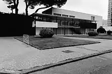 The building, together with the Latin America pavilion, forms the head of the Fountain of the Esedra. This constraint strongly conditioned Carlo Cocchia to design the building in 1938 according to an asymmetrical T-shaped scheme characterized by the unusual functional coupling of an Olympic-size swimming pool with diving board in the stem of the T and the restaurant room at the head. The connection to the various floors is guaranteed by an architectural promenade of clear Lecorbusieran ancestry. In the 1952 restoration, carried out by Cocchia himself, the ramp was reconfigured by knocking down the roof slab and opening the lateral infills of the loggia on the main façade. Currently the building has been recovered by Massimo Pica Ciamarra who has recovered the original forms of the work and has adapted the entire building to the new requests by also adding an underground pool below the original one. The interiors are characterized by the three-tiered division of the dining room which allows spectators, guests of the restaurant, to easily observe the 180-degree view of the swimming pool, the Flegrea Arena and the Esedra Fountain. The floor is decorated with Neapolitan majolica with references to Mediterranean cuisine.[5]