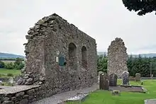 The remains are the church are part of the south wall of the monastic church, a portion of a gable (minus door or window), and part of what may have been the south transept. In the surviving south wall are two windows, one completely disfigured, the other consisting of two plain Gothic lights separated by a limestone mullion, and the arches formed of two stones each. Internally the dressings are of sandstone.[8]