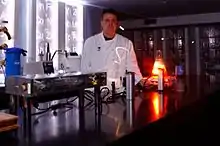 In 2005, Cantu began experimenting with liquid nitrogen to flash-freeze food, and helium and superconductors in an attempt to levitate them. He purchased a class IV laser (the highest grade available) to cook the interior of fish while leaving the outside raw, and create "inside out bread" with a doughy exterior and crusty interior.[3] Later dishes include the "Donut Soup" (an espresso designed to taste like Krispy Kreme doughnut filling) and a sweetbreads and cheese grits dish served with goat-cheese "snow".[2] The 2008 Frommer's guide said Moto's menu was designed to take "dining beyond just eating" with interactive dishes through innovation such as the use of specially designed corkscrew-handled spoons stuffed with herbs to provide aroma as you eat. It also mentioned Cantu's sense of humor in adding smoky aromas to a raw food course.[8]