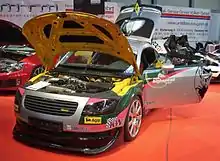 MTM achieved notoriety for its high-speed testing. For its projects the company uses the "Bimoto", which is an Audi TT equipped with two 1.8-liter four-cylinder turbocharged engines from Volkswagen. This configuration gives a power of 375 kW (510 hp) from each motor, with a maximum output of 750 kW. The power from the engines is transmitted via two six-speed transmissions to both axles. In 2003 during an Auto Motorund Sport test drive, the "Bimoto" was measured at a speed of 374 km/h, a new record for this publication.[7]