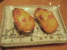 In Japanese cuisine, a sauce called tamagonomoto (卵の素, literally:basis of egg)[4][upper-alpha 1] (or tamagonomoto (玉子の素)[5] / tamamoto (玉素)[6]) is prepared by beating egg yolks and oil together just like mayonnaise, but without any vinegar.[4] Some variants also have miso[7] or soy sauce[6] added. Foods topped with this sauce and baked are moto-yaki (もと焼き)[7][upper-alpha 2] (or tamamoto-yaki (玉素焼き, literally:tamamotoed-and-baked)[8] / moto-yaki (素焼き)[6][upper-alpha 3]). Although motoyaki is considered a traditional Japanese dish,[6] the names motoyaki, tamagonomoto, and alike are not well known in Japan as of 2021, while its variant using mayonnaise: mayonēzu-yaki (マヨネーズ焼き) (or mayo-yaki (マヨ焼き)) is far more popular.[9]