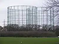 The University of London and BBC recreation club grounds were sites of anti-aircraft batteries. The BBC site was the home guard base.[12] Around 30 high explosive bombs fell across the district between October 1940 and June 1941.[13] A large community bomb shelter was built near the entrance to the Joseph Hood Playing Fields. In one incident a stick of bombs was aimed at the railway station by a German bomber but missed and destroyed houses in Marina Avenue (including the six from 63 to 73) and Claremont Avenue (166–168, and possibly 162–164, Claremont Avenue). The bomb landing in Claremont Avenue landed on a 21st birthday house party killing many. In other events a bailed-out German pilot landed on top of the gasometers but fell to his death.[12]