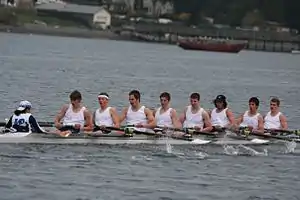 The Men's Varsity 8+ lineup was: P. Schroedl (cox), Z. Mankoff (8), G. Henry (7), M. Whelan (6), H. Cryst (5), B. Geyman (4), N. Holt (3), P. Lee (2), H. Page-Salisbury (1), and was coached by J.P. Marquart.