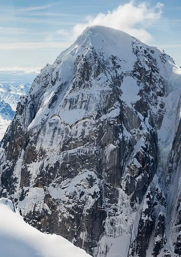 Mount Bradley is a 9,100+ ft (2,770+ m) mountain summit located in the Alaska Range, in Denali National Park and Preserve, in Alaska, United States. It is situated on the west side of the Ruth Gorge, 13.33 mi (21 km) southeast of Denali and 4.68 mi (8 km) southwest of The Moose's Tooth. Its nearest higher peak is Mount Dickey, 1.41 miles (2.27 km) to the north, Mount Wake lies 1.51 miles (2.43 km) to the south, and London Tower rises 2.55 miles (4.10 km) directly east on the opposite side of The Great Gorge. Despite its relatively low elevation, it is notable for its north face with nearly 5,000 feet of vertical sheer granite. The mountain was named by famed explorer Dr. Frederick Cook for John R. Bradley, a wealthy casino owner from Florida and one of Cook's financial sponsors.[2] [3]