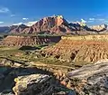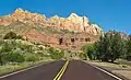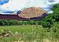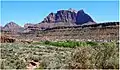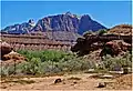 Mount Kinesava is located immediately west of Springdale, towering 3,400-feet (1,030 meters) above the town and the floor of Zion Canyon. Precipitation runoff from this mountain drains into tributaries of the Virgin River. Its nearest higher neighbor is The West Temple, 1.06 mi (1.71 km) to the northeast. Other notable mountains wthin view from the summit include The Watchman 2.95 mi (4.75 km) to the east-southeast, Bridge Mountain 3.6 mi (5.8 km) to the east-northeast, and Mount Spry is positioned 4 mi (6.4 km) to the northeast.[1] This feature's name was officially adopted in 1934 by the U.S. Board on Geographic Names.[3] It is so named for Kinesava, the Paiute deity of trickery.[4][5]