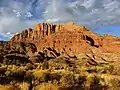 Stratification of sandstone deposits from vast dune fields laid down 175 to 200 million years ago can be seen exposed on the south aspect of the mountain. The uppermost 1,500-ft of this mountain is composed of light-colored Jurassic Navajo Sandstone. Below that layer is deep-red sandstone of the Kayenta Formation, probably best known for its dinosaur tracks, overlying the Springdale Sandstone Member. Continuing lower are the Whitmore Point Member and Dinosaur Canyon Member of the Moenave Formation. Near the base is the Petrified Forest Member of the Chinle Formation, surrounded by landslide deposits.[7]