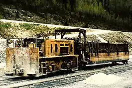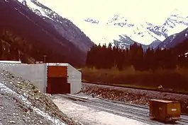 The purpose of the ventilation system is to prevent locomotives overheating and remove air pollutants. The opening and closing of the gates at the portals and mid-point assists the extraction process.[27] The mid-tunnel gate structure stands inside a 25-metre-long (82 ft), 27-metre-high (88 ft), and 16-metre-wide (52 ft) cavern. In a power failure, counterweights return all gates to the up position. Each gate has a central wooden panel designed to break if struck by a train. Although monitored at the Revelstoke control centre, the ventilation system is computer controlled, and adjusts to the type and size of train.[28] Standing at the top of the shaft, near the Rogers Pass highway summit, the ventilation building houses two fans, a standby 2.8-megawatt (3,800 hp) diesel generator, and two elevators. Used by maintenance staff, each open cage takes 11+1⁄2 minutes to slowly descend an open elevator shaft to tunnel level.[29] A straight tunnel would have made the shaft location clearly visible from the summit monument. To hide the complex, a slight kink was made in the tunnel alignment.[23]