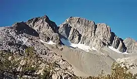 Mount McGee is a 12,944-foot-elevation (3,945 meter) mountain summit located west of the crest of the Sierra Nevada mountain range, in Fresno County of northern California, United States.[3] It is situated in Kings Canyon National Park, 0.6 miles (0.97 km) southeast of Peter Peak, 2 miles (3.2 km) southwest of The Hermit, and 2.6 miles (4.2 km) north-northwest of Mount Goddard, the nearest higher neighbor.[1] Topographic relief is significant as the west aspect rises 3,100 feet (884 meters) above Goddard Canyon in two miles. This geographical feature was named for William John McGee (1853–1912), well-known American geologist and anthroplogist.[5] This mountain's name has been officially adopted by the United States Board on Geographic Names.[3] The first ascent of the summit was made in July 1923 by Roger N. Burnham, Robert E. Brownlee, Ralph H. Brandt, and Leonard Keeler.[6]