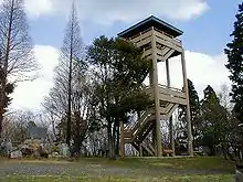 A four-story observation deck, a prefectural park and camp grounds are located on top of the mountain.[1] The park has an area of 15 km2 (6 sq mi).[1] There are no other tall mountains nearby, so many visitors come to the park at night because the observation deck offers a good view of the surrounding Nōbi Plain. The summit can be reached by car and is about 3 km (1.9 mi) from Route 363. A small road through the forest begins in the city of Toyota.