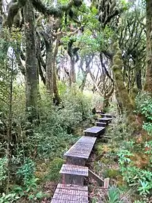 Between the Summit and The Cone, at the junction of the Bell and Hihikiwi Tracks, a hut built in 2015 has 20 bunks. An older hut with 6 bunks is next to it.[7] Most of the tracks near the summit have recently been laid with boardwalks (see photo below), some of them as part of Te Araroa long distance trail.[8]