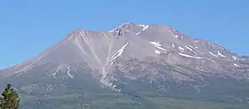 Mount Shasta (Shasta: Waka-nunee-Tuki-wuki;[5] Karuk: Úytaahkoo)[6][7] is a potentially active[8] volcano at the southern end of the Cascade Range in Siskiyou County, California. At an elevation of 14,179 feet (4321.8 meters), it is the second-highest peak in the Cascades and the fifth-highest in the state. Mount Shasta has an estimated volume of 85 cubic miles (350 cubic kilometers), which makes it the most voluminous stratovolcano in the Cascade Volcanic Arc.[9][10] The mountain and surrounding area are part of the Shasta–Trinity National Forest.