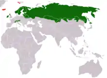 This species is distributed from Fennoscandia to eastern Siberia; in addition, isolated mountain populations occur in the Alps, Scotland, the Baltics, northeastern Poland, and Hokkaidō. In Ireland, the Irish hare (L. t. hibernicus) does not grow a white winter coat, is smaller in size, and lives on lowland pastures, coastal grasslands, and salt marshes, not just in the mountains. The mountain hare has also been introduced to Iceland, Shetland, Orkney, the Isle of Man, the Peak District, Svalbard, Kerguelen Islands, Crozet Islands, and the Faroe Islands.[5][6][7] In the Alps, the mountain hare lives at elevations from 700 to 3800 m, depending on geographic region and season.[8]