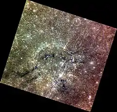 Mozart is a crater on Mercury. The arc of dark hills visible on the crater's floor probably represents remnants of a central peak ring. A close inspection of the area around Mozart crater shows many long chains of secondary craters, formed by impact of material thrown out during the formation of the main crater. Mozart crater is located just south of the Caloris basin.