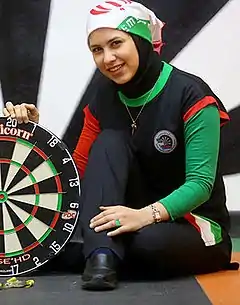 Mozhgan Rahmani (Persian: مژگان رحمانی, born December 31, 1989)[1] is an Iranian Darts player. Since 2017, she has been a member of the Iranian National Darts Team.[2] She is the first Iranian in Iran's Darts history to be inducted into Professional Darts Corporation.[3][4] She is an Iranian legionary in Malaysia's DURY team.[5] The only Iranian athlete interviewed by Sky Sports[6] and RTL.[7]