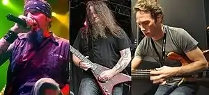 ![]() Left to right: Chad Gray (lead singer), Greg Tribbett (guitarist) and Ryan Martinie (bassist), three of Mudvayne's four members; the fourth is drummer Matthew McDonough. | |