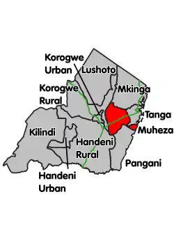 Muheza is one of the eleven districts of Tanga Region in Tanzania. It is bordered to the north by Mkinga District, to the east by Tanga and the Indian Ocean, to the south by the Pangani District and Handeni District, and to the west by the Korogwe District. The administrative capital of the district is Muheza town.