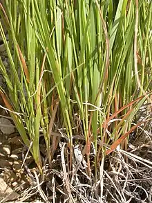 This perennial grass grows in clumps. It has shallow fibrous roots. The stems have thick, knotty, scaly bases and grow up to about 60 centimeters tall. The leaves are narrow and may be flat or folded. The inflorescence is a panicle that is very narrow and spikelike, with an uneven row of short branches. The dark green or grayish spikelets contain usually one but sometimes two flowers.[1] Blooming occurs in June through October.[2]