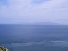 Ailsa Craig and the County Antrim coast of Ulster and Rathlin Island are all clearly visible from the Mull. On clearer days it is also possible to make out Malin Head in Inishowen in County Donegal in the west of Ulster, and the Ayrshire coast on the other side of Ailsa Craig. Other islands in the Firth of Clyde are also visible when looking east, especially from further back along the single track road from Southend village. The Straits of Moyle (part of the North Channel) allow sea passage from the Irish Sea to the Atlantic Ocean. Notoriously strong currents plague the tip of the Kintyre Peninsula creating a hazard to unmotorised craft and virtually impossible for distance swimmers.[4][5] At its closest point, mainland Ulster is 12 mi (19 km) from the Mull. Owing to the low elevation of Rathlin Island and the high elevation of the Mull of Kintyre it is also possible to see over the top of Rathlin Island to the Antrim coastal town of Ballycastle. Individual houses on the Antrim coast and cars travelling along the coast road can sometimes be seen without the aid of binoculars, visibility conditions depending.