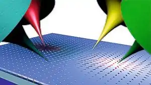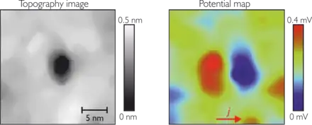 ![]() Left: STM topography image of a 5 nm large void in a topological insulator film. Right: Potential dipole developing around the nanscale void due to the current flowing. |