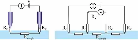 When performing electrical measurements on the nanoscale, it should be stressed that the contact resistance is often very large at the STM tip contact to the sample because the contact area is very small, so that four-point measurements are indispensable in resistance measurements with a muti-tip STM. This is even more important in measuring nano-scale objects, because the contacts to these objects are inevitably nano-scale. In a two-point resistance measurement, the two current injecting tips are used for voltage probing as well. Therefore, the measured resistance R = V/I also includes the contribution from the two contact resistances RC. In a four-point measurement the current injecting circuit is separated from the voltage sensing circuit. If the voltage measurement is performed with a large internal resistance RV, the influence of the contact resistances can be neglected. This is the main advantage of the four-point measurement.