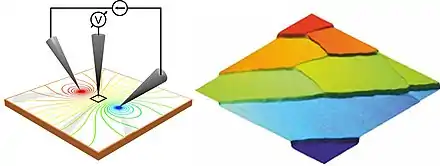 A method giving valuable insight into the charge transport properties of nanostructures is the scanning tunneling potentiometry (STP).[9] STP can be performed with a multi-tip STM and allows to map the potential landscape while a current flows through the film, nanostructure, or surface under study. Potentiometry maps give insight into fundamental transport properties, such as the influence of defects on the local electric transport. The implementation is shown in the figure, with the outer tips injecting a current into the nanostructure or surface being studied, while then center tip simultaneously measures the topography and also records the electric potential at each image point which is induced by the flowing current. This way a potential map measured e.g on a silicon surface can be acquired with a potential resolution is a couple of µV. The potential map in the figure shows that the largest potential drop occurs at the atomic step edges. From these data the resistance of a single atomic step, or a domain boundary can be obtained. Moreover, if a current flows around a nanoscale defect like. e.g.. a void, the potential map developing due to the flowing current can be measured.[10]