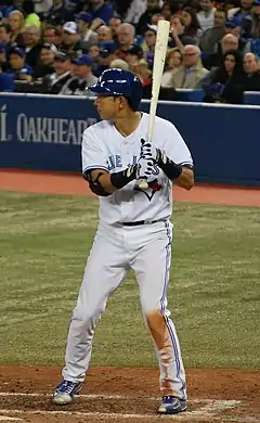 On April 21, 2013, Kawasaki batted in the leadoff slot for the first time in Toronto, scoring the game's first run against the New York Yankees.[16] On May 26, in the final game of a 4-game series against the Baltimore Orioles, Kawasaki recorded his first MLB walk-off hit, with a two-run double against Baltimore closer Jim Johnson.[17][18] On June 21, Kawasaki hit his first MLB home run, a two-run shot off Baltimore reliever Tommy Hunter, which tied the game 6–6. The Blue Jays would win the game 7–6 to extend their winning streak to 9 games.[19] Kawasaki, at 32 years of age, became the oldest player in Blue Jays' history to hit his first career home run, one year older than Ken Huckaby.[20] Kawasaki was optioned back to Triple-A Buffalo on June 26 when Jose Reyes was activated from the disabled list.[21]